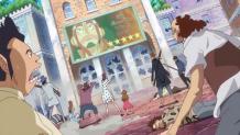 The Straw Hat Pirates, Law, Kinemon and Momonosuke arrive at Dressrosa. There, they go to a restaurant where they see an old man Zoro encounters earlier, gambling with a great amount of wealth.