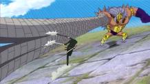 After the flashback, Luffy and Chinjao prepares for their final showdown. At the ending, Luffy delivers a punch imbued with Busoshoku Haki towards Chinjao's head, bringing back its drill-shape. Chinjao falls unconscious and breaks the platform into two as a result of landing headfirst on it. Lucy is declared as the winner of Block C