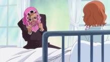 Back at the Sunny, Nami is fending off Jora but finds her Clima Tact turned into a yet another piece of art as Jora reveals that she ate the Ato Ato no Mi and became an art human. At Green Bit, the fight between Doflamingo and Law is still going on with Law being barely able to keep up with Doflamingo's might.