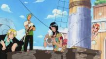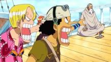 Following a fight in the bar, Luffy, Zoro and Nami meet a man outside the bar who tells them that Sky Island does exist. As they leave Mock Town, they get into a fight with Masira's brother Shōjo, another salvage monkey.