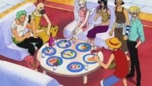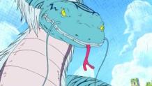 A giant python makes Luffy, Robin, Chopper and Zoro split while going to the ruins at the south.