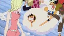 Nami finds out what should happen to anyone who enters the forest. Meanwhile, the rest of the gang are waiting for the wind to change but are rudely assaulted by Skypiea's police who are going to carry out Heaven's Judgement.