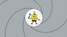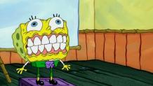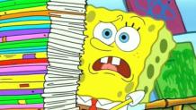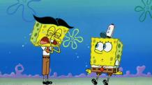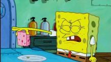 SpongeBob battles a persistent speck of food that is on a plate.