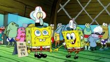 SpongeBob competes against a patty-making machine.