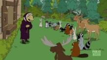 Marge and Lisa visit the nail salon where they engage in a spirited debate as to whether a woman can be smart, powerful and beautiful all at the same time and spin four tales of famous women featuring famous Springfield faces: Selma as Queen Elizabeth I, Lisa as Snow White, Marge as Lady Macbeth and Maggie as Howard Roark, the idealistic architect protagonist from Ayn Rand’s The Fountainhead.