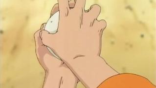 After passing stage one of the training, Naruto moves into stage two: power training. Jiraiya realizes that, like him, Naruto has a hard time concentrating, so he paints a spiral in the palm of Naruto's hand to help him to focus. With the aid of the spiral and a quick flashback to Iruka-sensei, Naruto completes stage two. Meanwhile, Tsunade's luck has become uncommonly good, which worries her. After being talked into sightseeing by her assistant, Tsunade meets Orochimaru… and she doesn't look at all pleased.