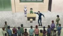 Gon and his friends have advanced to the final phase of the Hunter Exam. The final phase is a tournament where the winners are out and the losers advance. The rule is that if you kill your opponent, you'll be disqualified. The first mach is Gon versus Hanzo. Gon can't do anything against Hanzo, but he refuses to give up. Hanzo is losing his patience and threatens to break Gon's arm.