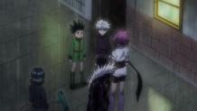 Gon and his friends are hoping to win the reward that's been placed on the Phantom Troupe. At the same time, Machi and Nobunaga have been dispatched to search for the "chain user" because Uvogin hasn't returned. Gon and Killua receive a tip and begin shadowing the two Troupe members.