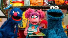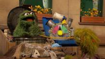 Abby and Cookie Monster help Grover sort through the Lost and Found to help him remember what his mommy needs for the Sidewalk Sale.