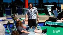 The guys mix it up with fellow passengers by turning the pool deck into their personal playground, then offer a boatload of misinformation as they pose as entertainment directors