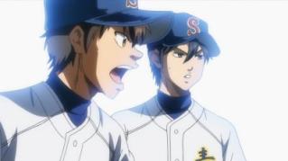 At the top of the ninth, Seido is behind 3-4. Haruichi gets a base hit, and Miyuki follows up with one as well. Next up is Maezono. He stands in the batter's box with a mission. Swing and miss. Swing and miss. With two strikes, his back's on the wall.