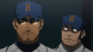 The game resumes in the bottom of the sixth. Miyuki gets on with a lead-off double, but Furuya misses the signal and pops out to the third baseman. In the end Miyuki advances to third, but Seido fails to score. At the top of the seventh Furuya walks the lead-off batter and gives up three consecutive hits. Seido gets one out, but Furuya falls behind again 2–0. Coach Kataoka decides to change pitchers and inserts Sawamura, whom has been warming up in the bullpen during the entire rain delay. Teito's batters try to focus on Sawamura's inside pitch but are shocked with Sawamura's crazy smile and all his outside pitch focus. Sawamura manages to strike out the first batter and gets the next one to ground out to third, halting Teito's momentum with only 1 run.
