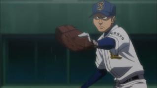 Sawamura's arrival causes a slight change of pace in the game. Mukai begins throwing more balls and Seido finally manages to start getting on base more consistently. However the weather continues to hamper Seido, even leading to a bunt failure from Sawamura. Sawamura counters by continuing to pitch to the outside and forcing 1-2-3 innings until the top of the eighth. A double with two outs gives Teito a chance to increase their lead, but Sawamura forces a ground out to first base to end the inning. At the bottom of the eighth Mukai forces the first two batters out before giving up a single to Toujou Hideaki and a double to Kuraomichi. Not wanting to risk a turnaround, Teito walks Haruichi to load the bases and face off against Maezono Kenta who is hitless on the day.
