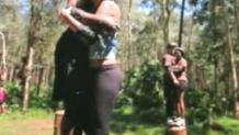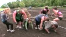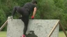 The clue comes and the group finds out they need to be "dressed sharp" for their next challenge. Turns out they'll be doing "Target Training." After running through a training course and taking aim with some paintball guns, they teams have to grab a 70-lb aboriginal "artifact" and run back through the obstacle course.
