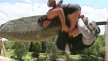Each team realizes that time is almost up and everyone discusses how important it is to win the upcoming challenge--a crocodile death roll. As the fake croc spins faster and faster, each team struggles to hold on. It's not so easy. After a few rounds of spinning Kenny and Tina edge out Diem and Derrick for victory. Not only do they get to decide who goes into Exile, they also win a Kicker car audio system.