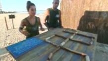 In the challenge, the teams are literally thrown to the sharks. They must collect puzzle pieces scattered across a tank while avoiding multiple types of sharks. Of the eight teams, five teams are disqualified and Shane and Linette again pull off a victory. After a team meeting, they choose Eric and Katie to go into Exile.