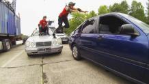 After arriving in Berlin, tension causes players to lash out at one another; competitors must race across speeding trucks.