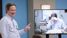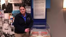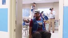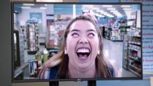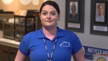 Garrett instructs the other employees how to properly close up shop with a VR training video.