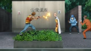 Saitama meets a group of villains in a public restroom who mistake him for their ally, they introduce themselves to Saitama, but when he reveals he's a hero, attempt to defeat him.