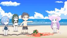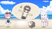 Subaru appears at a beach (reference to fanservice episodes), he compliments Crusch's and Rem's swimsuit accordingly. Rem suggests that they play Suikawari since they are at the beach. Crusch was the first to try and she claim to be able to hit the watermelon in one swing. Rem is up next however she used her watermelon designed Flail instead and smashed the watermelon. Anastasia popped in and expressed her disappointment for not being able to sell the ruined watermelon.