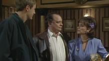 1996 Christmas Special (Part 1): Rodney’s fertility schedule is wearing him down. Such is Cassandra’s need to have a baby, he buys her a rabbit, Roger, to care for until a little one arrives. Del has a shipment of Latvian alarm clocks he can’t shift and his home improvement grant has been rejected. It’s Rodders’ birthday, and Del buys him a cheap gold bracelet inscribed ‘Rooney’. Finding themselves on a rare boys' night out, they dress up as Batman and Robin for a fancy dress party held for a local publican. En route, they prevent Councillor Murray from being mugged. They arrive at the party, to discover it’s actually a wake as the host (Harry Malcolm), had died the day before. The following day Del is awarded a bravery medal for tackling another mugger, and Cassandra has good news: She's pregnant.
