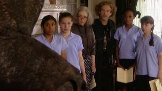 Mildred borrows HB's broomstick, planning to bring it back before her teacher finds out, and starts off after the boat. She lands and sees Miss Hardbroom sprawled on the deck. Tying off the broom, she orders it to pull them back, but the rope breaks when the boat fetches up on some rocks, and the broom sails away into the distance. Meanwhile, Merlin's practicing his magic in the cave again when he hears a voice in the rocks. He unwittingly frees a very angry dragon lord, who's convinced that Rowan-Webb stoled his treasure and sets off for the house with Merlin in tow. The rest of the students are grudgingly reading a balad about the very same dragon lord, when Drusilla asks to be excused. Seeing her oportunity, Maud follows her and corners her demanding to know where Mildred is. Just then, the dragon lord arrives and traps everyone except Maud and Drusilla in the living room. Miss Cackle and Algernon try to talk some sense into him, but he simply grows more adgitated. Learning the w