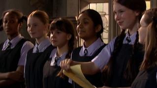 The third years are writing their last exam and Mildred is drawing a picture of Miss Hardbroom (an unflattering one) while she waits for the exam to end. It does, and they all sing, and dance and throw magical confetti. ""Last one, last one, last one!"" -- to the tune of ""three two, three two, three two!"" as sung by Baz and Gaz in the first season. Miss Drill thinks it's fun and they magic her some daisies. Miss Hardbroom shows up and tells them all off. Mildred and co. go back to DOBS where Fenella and Griselda are playing chess. They complain that it's not fair to keep them at school when all their exams are done. Fenny and Gris tell them that there's a fair in town, and they'll make sure no one notices if they skip off (only there's a British term for it that made me blink). They get dressed in normal clothes (they look so much better in normal person clothes) and go wandering off. HB and Drill argue about whether the display in the corridor (with the confetti and wot not) was