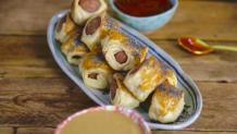 Molly Yeh makes a delicious buffet spread for her sister-in-law's baby shower. The menu includes "Walking" Fish Tacos with Crunchy Cabbage Slaw and Cilantro Dressing, Pigs in a Blanket with Harissa Ketchup and Honey Mustard and her signature meatless Meatball Sliders with a Twist. Molly's Baked Donuts with Rhubarb, Blood Orange and Blueberry glazes then take center stage on the dessert table.