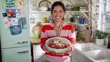 Molly Yeh makes her favorite Middle Eastern dishes with a Midwestern touch. She prepares her fried Squash Falafel with a spicy Chipotle Ranch drizzled on top, super hearty and Meaty Twice Baked Potatoes with spicy harissa ketchup and her take on Basbousa, a nutty and sweet semolina cake cloaked in tart Cherry Compote for dessert. Plus, she has delicious Date Cream Soda Floats to sip and spoon on the side.