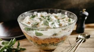Molly Yeh and her husband, Nick, are going to a potluck dinner, and Molly's bringing some of her favorite Midwestern dishes with a twist, like her beautiful 8-Layer Salad loaded with sweet squash and farro. She also makes chewy Halva Magic Bars and a sweet Peanut Butter Mocha Mix. But before they head out, Molly bakes Bacon, Egg and Cheese Turnovers for a satisfying little farm lunch for two.