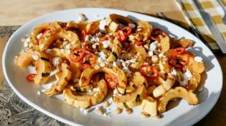 Molly Yeh is making an easy and hearty lunch for the Hagen family farmers, and she's using some of her favorite pantry staples -- with a twist -- to fill them up on a budget. She starts by making cheesy Meatball-Stuffed Biscuits and a side dish with a little kick, Spicy Roasted Delicata Squash. Then Molly prepares Creamy Polenta with Crispy Bacon and Chard as well as Cinnamon Cookies and Cream Meringues that look like mini dessert clouds covered in tasty cookie soil.