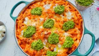Molly Yeh is celebrating her husband's birthday with a delicious, Italian-inspired meal and friendly little roast -- with plenty of cheese! She makes Meaty Ziti with Pesto Dollops, spicy and briny Giardiniera Bruschetta and crispy Fried Olive Salad with creamy harissa dressing. Dessert is a classic Red Velvet Birthday Cake with sweet cream cheese frosting. Break out the flatware and the funny -- it's time for dinner, honey!