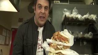Adam tries to eat three overstuffed sandwiches with fries on top at Lucky's Sandwich Company.