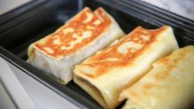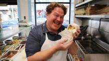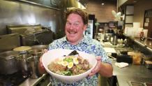 Casey tries a falafel sandwich before he tackles the Monte Cristo Reeto with turkey, ham, bacon and swiss cheese wrapped in a tortilla; The Bay Area's biggest bowel of ramen in the Masumo Challenge.