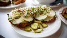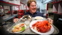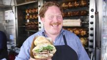 Casey Webb tries to tri-tip steak sandwich and steamed local crab in Santa Barbara, California.