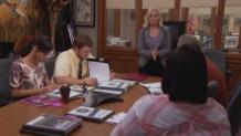Leslie discovers that the Parks Department budget is about to be cut, and she later meets the City Council member she is running to replace. Chris and Ron visit a meditation center.