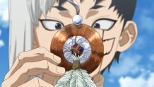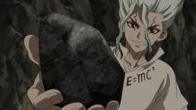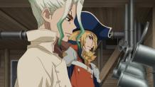 Suika and Ginro work together to rescue the mobile lab from the Perseus. Reunited with Senku and the others, the group works on items to help Kohaku with the selection process.