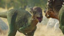 In a drought-stricken basin where much has perished, an old Pachycephalosaurus bull defends his leadership against a young challenger.